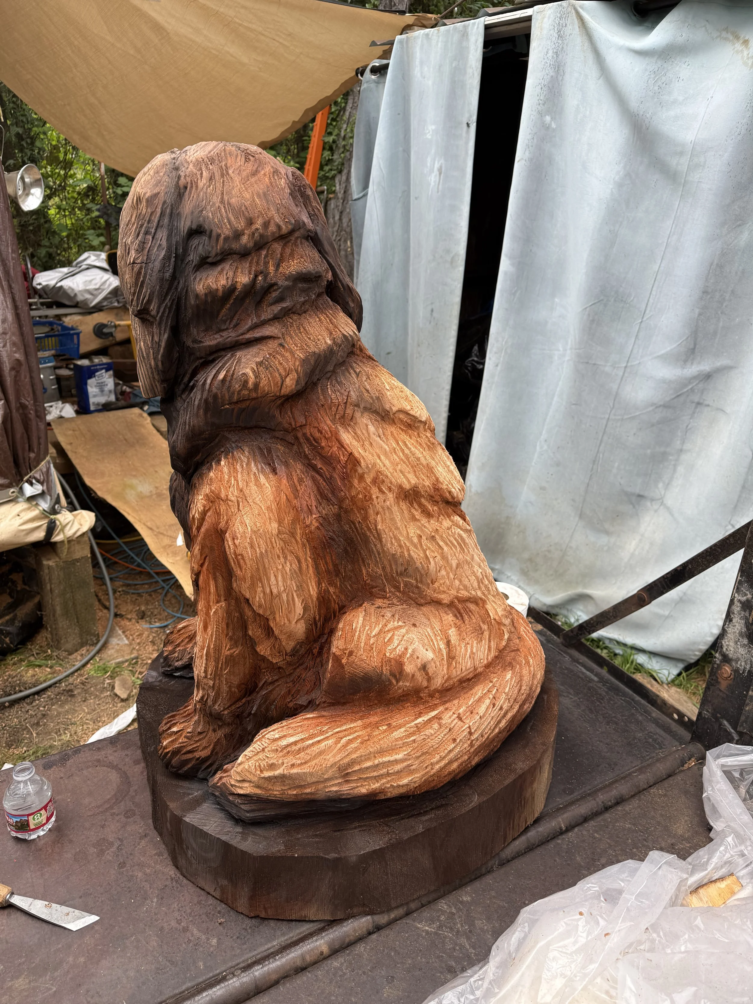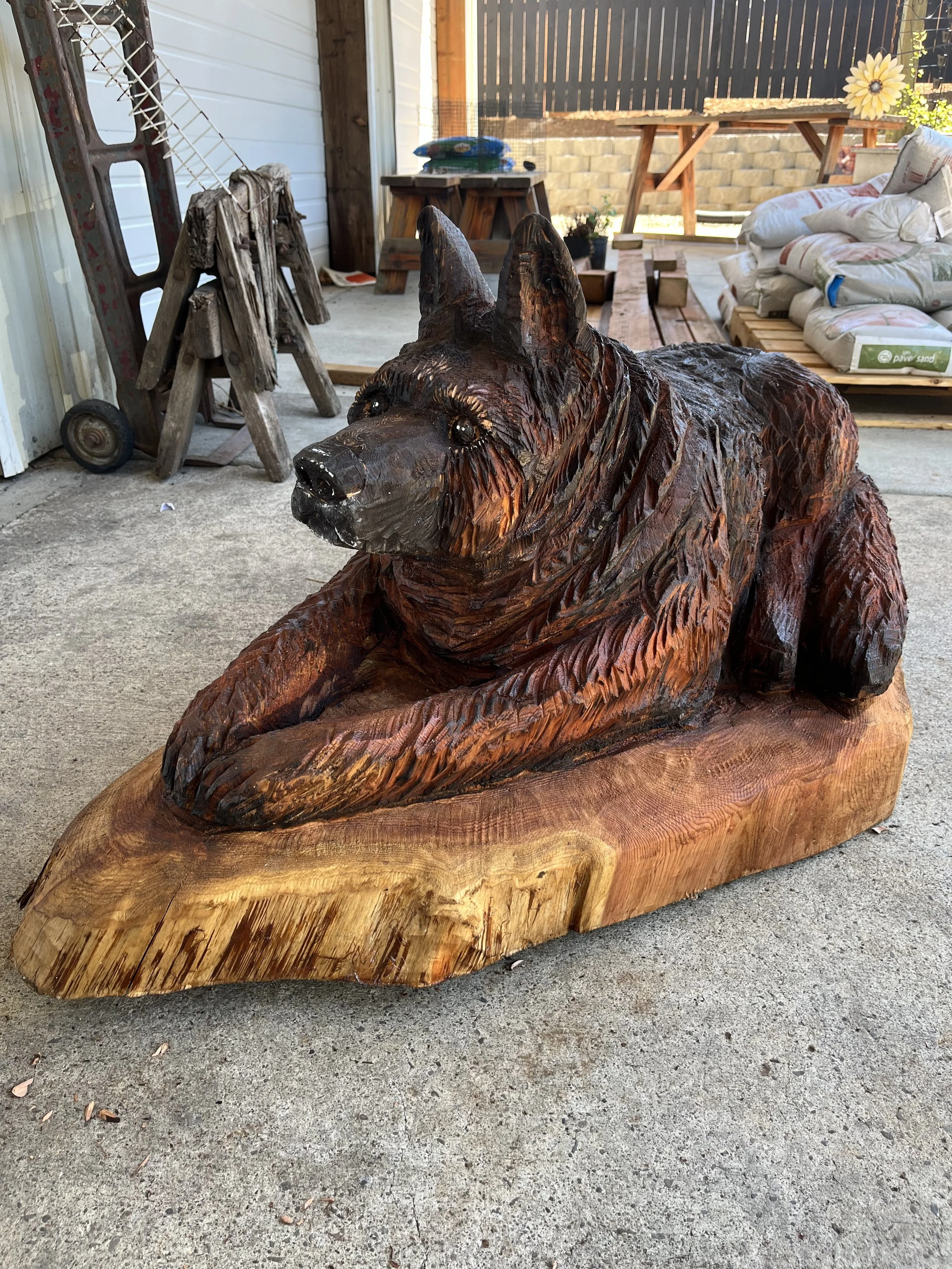I love dogs and mine pretty much goes everywhere with me. My Shepherd/Akita rescue I named Hanz finds his way into a good amount of photos and if we work together you’re guaranteed to meet. Don’t worry, he’s the kindest creature I’ve ever met. I enjoy painting and carving ‘pet portraits’. I take tremendous pride in the final stages of finishing often using stain and detail in ways other carvers cannot to capture your companion’s likeness from photos. I guarantee your carving will look like your dog, not just A dog. Any animal, anytime, challenges welcomed.
